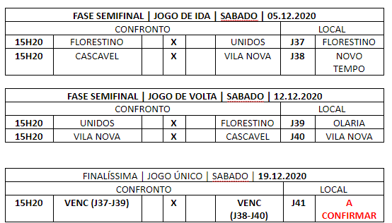 Encerrada a fase classificatória, foram definidos os confrontos da fase semifinal que definirá os times que disputarão a grande final em 19 de dezembro, fechando a difícil temporada esportiva de 2020.