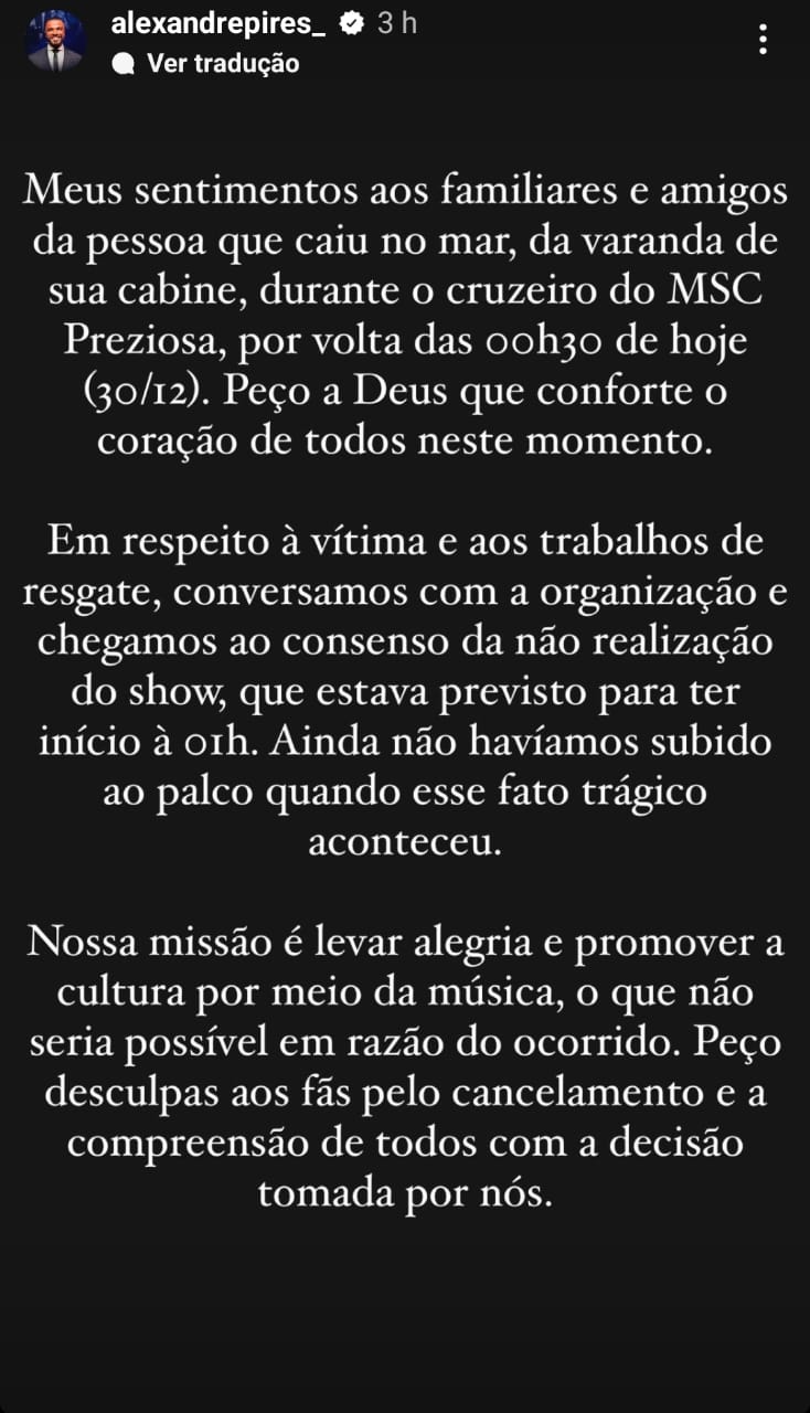 O show de Alexandre Pires a bordo do cruzeiro MSC Preziosa, previsto para acontecer na madrugada deste sábado (30) foi abruptamente cancelado devido a um incidente grave. Uma pessoa caiu no mar, levando à suspensão do evento, conforme divulgado pela equipe do cantor em uma nota publicada no Instagram de Alexandre Pires. “Ainda não havíamos subido ao palco quando esse fato trágico aconteceu”, informou o comunicado. Até o momento, não foram fornecidas informações oficiais sobre a vítima do acidente.