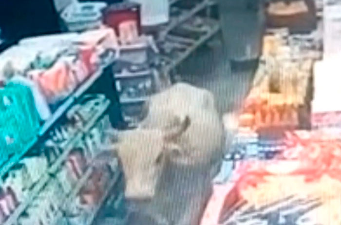 Dois bois, que teriam fugido de uma fazenda, estavam na rua. Um dos animais entrou na mercearia e começou a derrubar os produtos da mercearia e chegou a ir para o fundo do estabelecimento, derrubando mais itens.