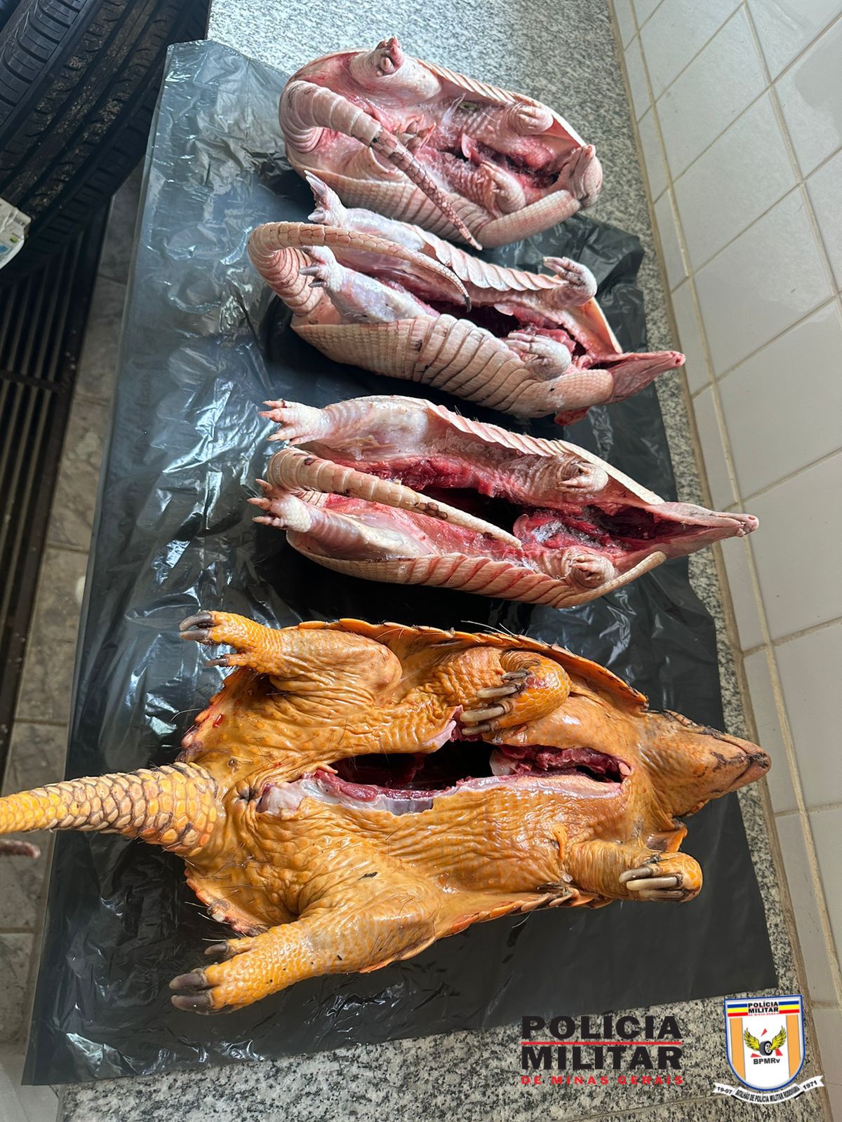 Durante a Operação Rota Segura na rodovia LMG 634, km 67, em Almenara, a Polícia Militar Rodoviária abordou um veículo Fiat Palio branco. A inspeção no automóvel revelou uma caixa de isopor no porta-malas contendo quatro tatus mortos.