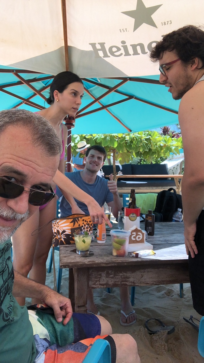 Marciano levou o genro belga, chamado Benôit (ao centro da foto) para conhecer o litoral baiano. Também na foto, Marcela Ceolin e Otávio Ceolin, filhos do professor. Foto: Marciano Ceolin/Arquivo Pessoal.