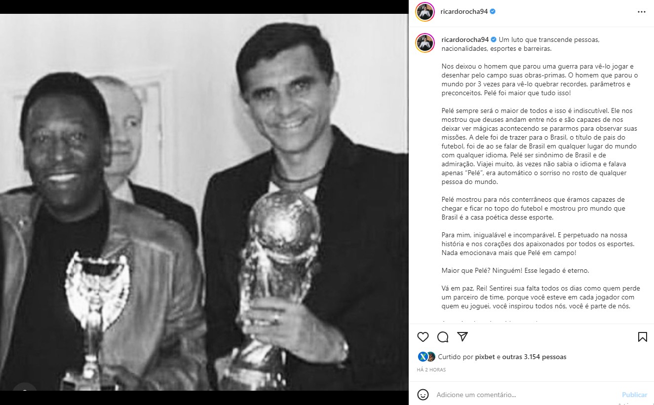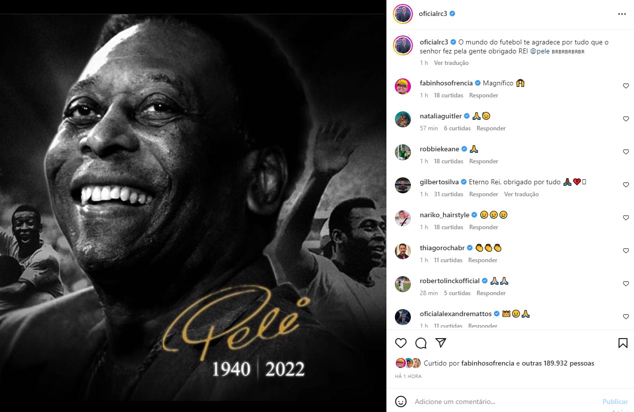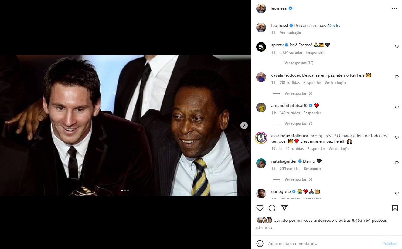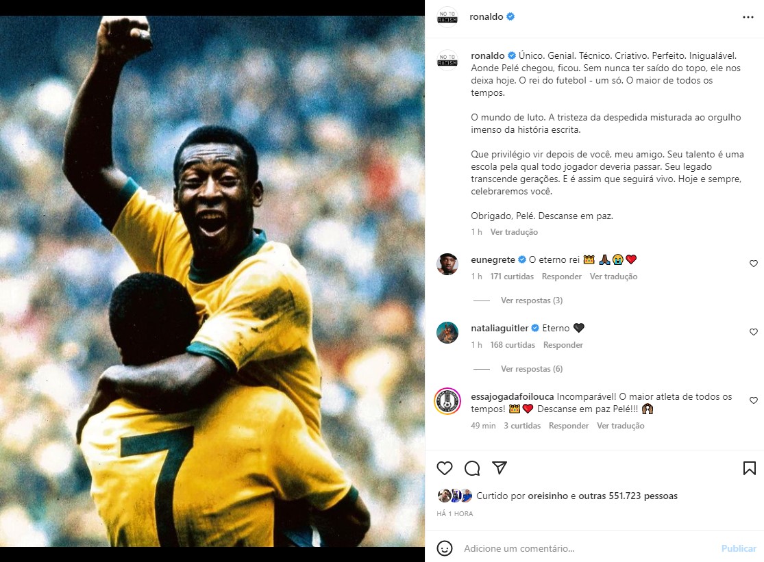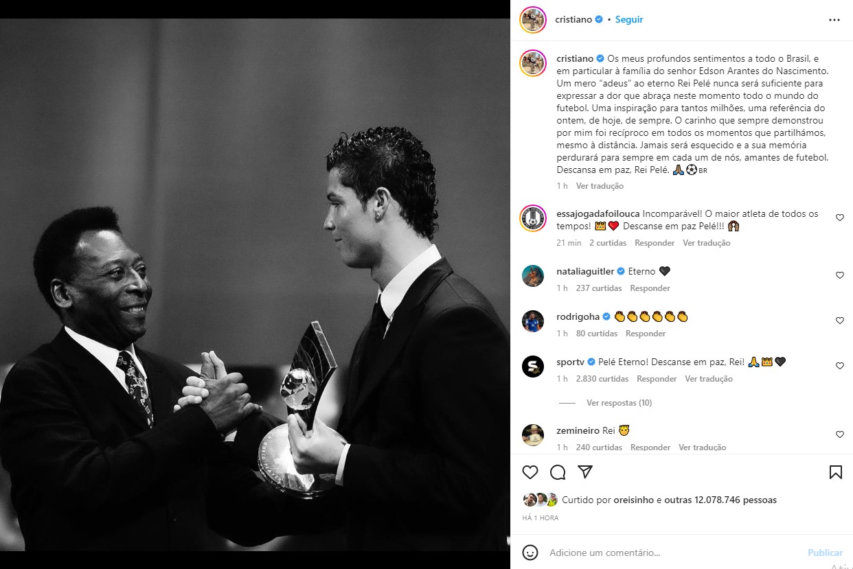 “Os meus profundos sentimentos a todo o Brasil, e em particular à família do senhor Edson Arantes do Nascimento. Um mero “adeus” ao eterno Rei Pelé nunca será suficiente para expressar a dor que abraça nesse momento todo o mundo do futebol. Uma inspiração para tantos milhões, uma referência do ontem, de hoje, de sempre. O carinho que sempre demonstrou por mim foi recíproco em todos os momentos que partilhamos, mesmo à distância. Jamais será esquecido e a sua memória perdurará para sempre em cada um de nós, amantes de futebol. Descansa em paz, Rei Pelé”, disse CR7.