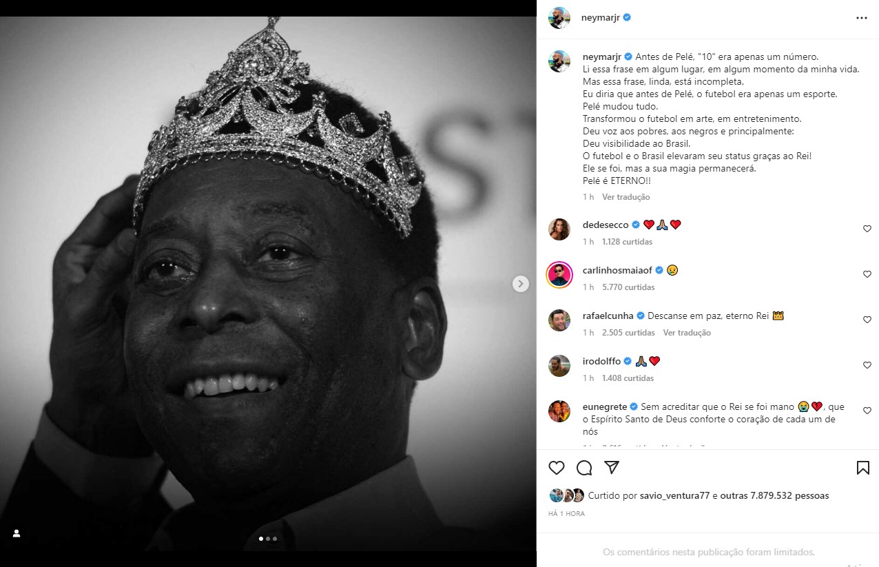 “Antes de Pelé, "10" era apenas um número. Li essa frase em algum lugar, em algum momento da minha vida. Mas essa frase, linda, está incompleta. Eu diria que antes de Pelé, o futebol era apenas um esporte. Pelé mudou tudo. Transformou o futebol em arte, em entretenimento. Deu voz aos pobres, aos negros e principalmente: deu visibilidade ao Brasil. O futebol e o Brasil elevaram seu status graças ao Rei! Ele se foi, mas a sua magia permanecerá. Pelé é ETERNO!!”, disse o craque brasileiro.