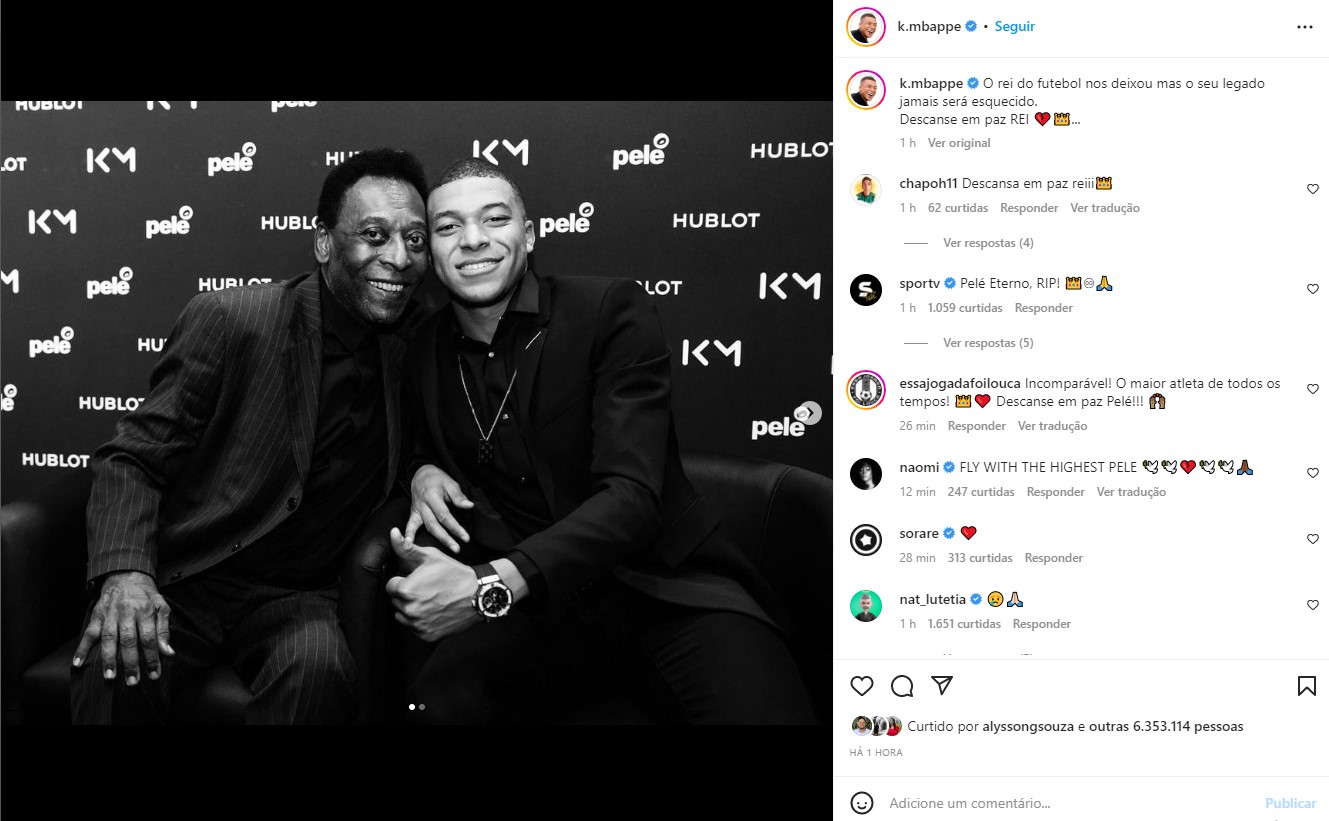 Messi, por sua vez, apenas escreveu em suas redes sociais a frase “descanse em paz, Pelé”. Na postagem, o jogador ainda compartilhou algumas fotos que tem com o ídolo brasileiro. Já Kylian Mbappé, disse sobre o legado que Pelé deixou no futebol. “O rei do futebol nos deixou, mas o seu legado jamais será esquecido. Descanse em paz REI”, disse o jogador.