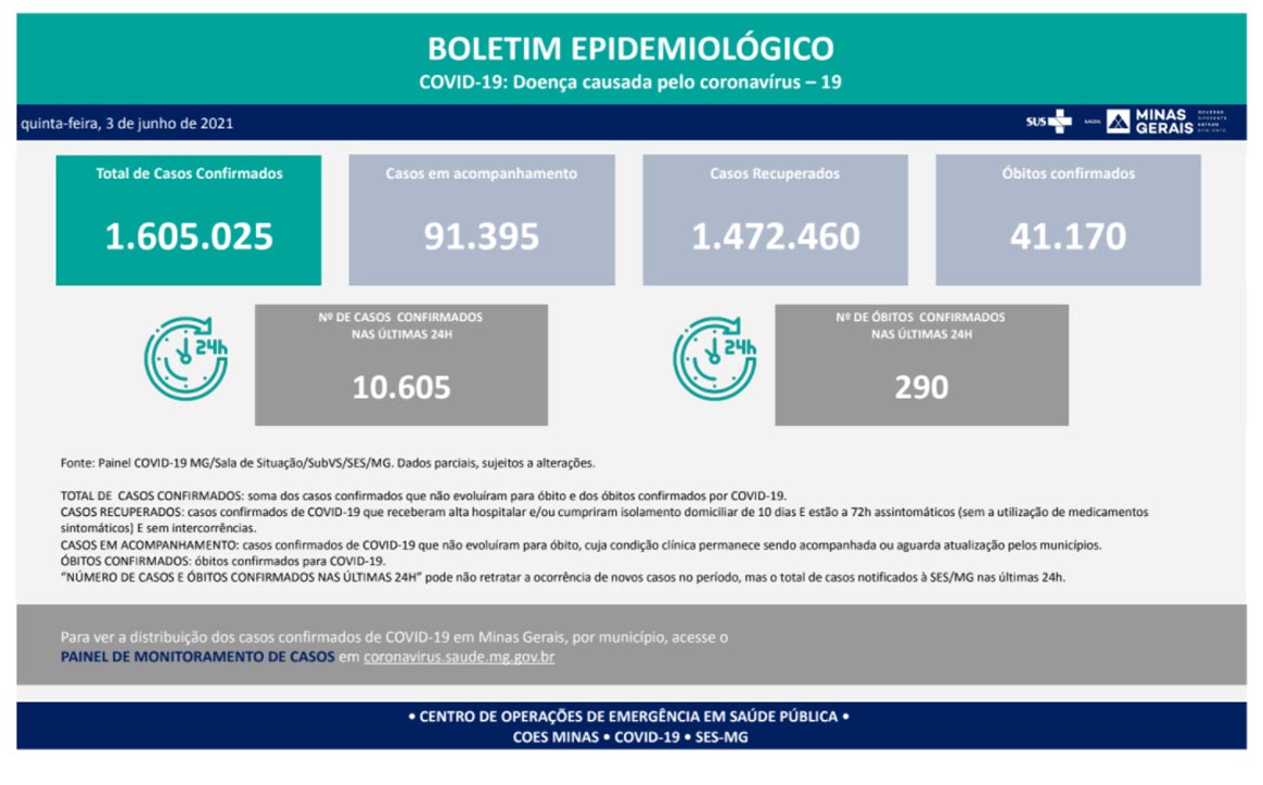 De acordo com o boletim epidemiológico divulgado pela Secretaria de Estado de Saúde (SES), nesta quinta-feira (01) Minas Gerais registrou 290 mortes em decorrência da Covid-19 nas últimas 24h.