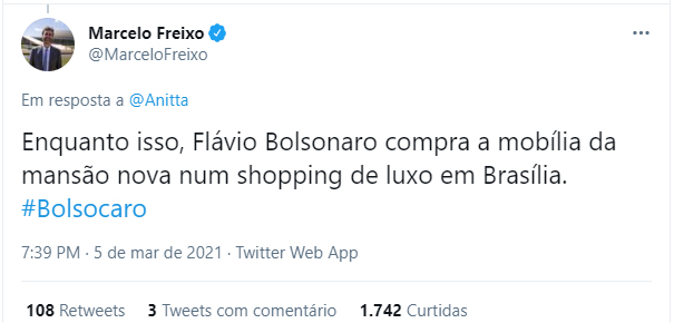 “Enquanto isso, Flávio Bolsonaro compra a mobília da mansão nova num shopping de luxo em Brasília.