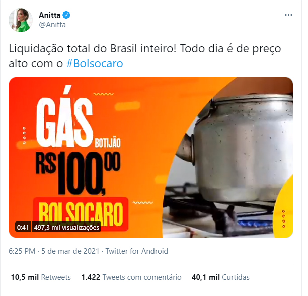 Na noite da sexta-feira (05), a cantora Anitta compartilhou um vídeo no seu perfil do Twitter que contém diversas críticas ao governo de Jair Bolsonaro. Uma delas é o aumento dos preços de variados produtos.