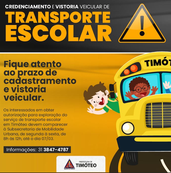 Com o término previsto para o dia 7 de março, a Prefeitura de Timóteo, por meio da Subsecretaria de Mobilidade Urbana está realizando o credenciamento e a vistoria do transporte escolar. A ação tem o objetivo garantir a segurança dos usuários do serviço, fiscalizar a situação cadastral dos transportadores autorizados a explorar a atividade, bem como verificar as condições de circulação, integridade e atendimento as exigências legais dos veículos.