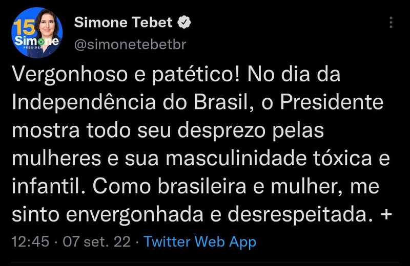 "Vergonho e patético! No dia da Independência do Brasil, Presidente mostra todo seu desprezo pelas mulheres e sua masculinidade tóxica e infantil. Como brasileira e mulher, me sinto envergonhada e desrespeitada”, escreveu Tebet