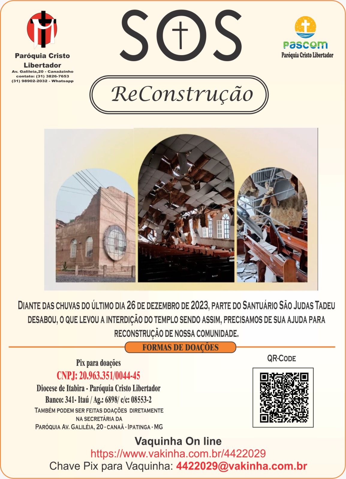A comunidade da paróquia onde fica o Santuário São Judas Tadeu, em Ipatinga, está mobilizada na campanha “SOS ReConstrução” para arrecadar fundos e contribuir para as obras do santuário. O temporal que atingiu a cidade derrubou a estrutura do telhado e forro. O templo chegou a ser interditado. O padre Uíldes Flávio Assis, pároco da Paróquia Cristo Libertador fala, ao vivo, ao Plox sobre a campanha de doações e sobre o cronograma da obra.