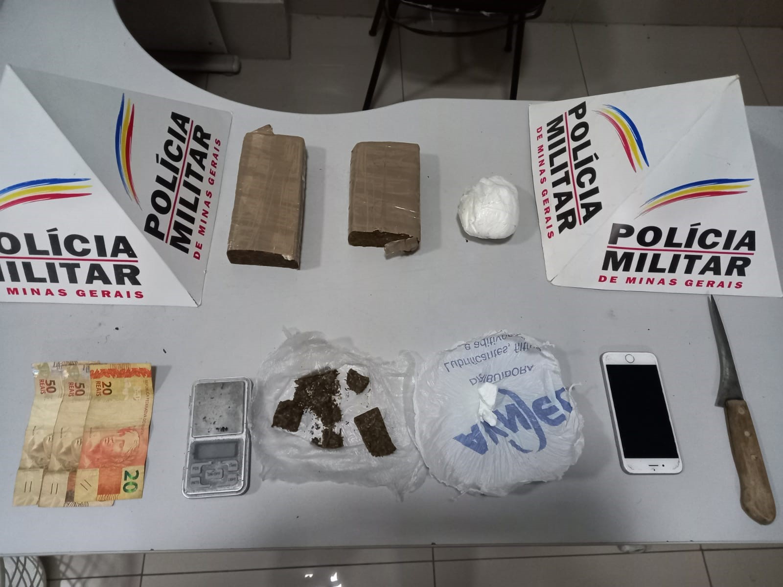 Conforme divulgado pela PM, ao todo na operação, os policiais apreenderam: 21 barras, 19 buchas e três porções de maconha; uma porção de cocaína; duas balanças de precisão; dois rolos de plástico e R$156.