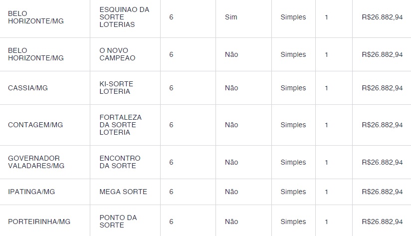 A quina teve 90 ganhadores, com prêmio individual de R$ 26.882,94. Acertaram quatro números 5.989 apostadores, que receberão cada um, R$ 577,12. Oito apostas de Minas Gerais foram ganhadoras na quina. Umas delas feita no município de Ipatinga, na loteria Mega Sorte, no bairro Limoeiro.