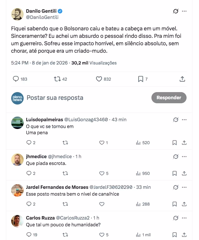 Internautas reagiram com comentários de reprovação, apontando falta de empatia e cobrando mais sensibilidade. Alguns usuários afirmaram que a publicação revelaria um nível de agressividade incompatível com o momento delicado vivido por Bolsonaro após a queda.