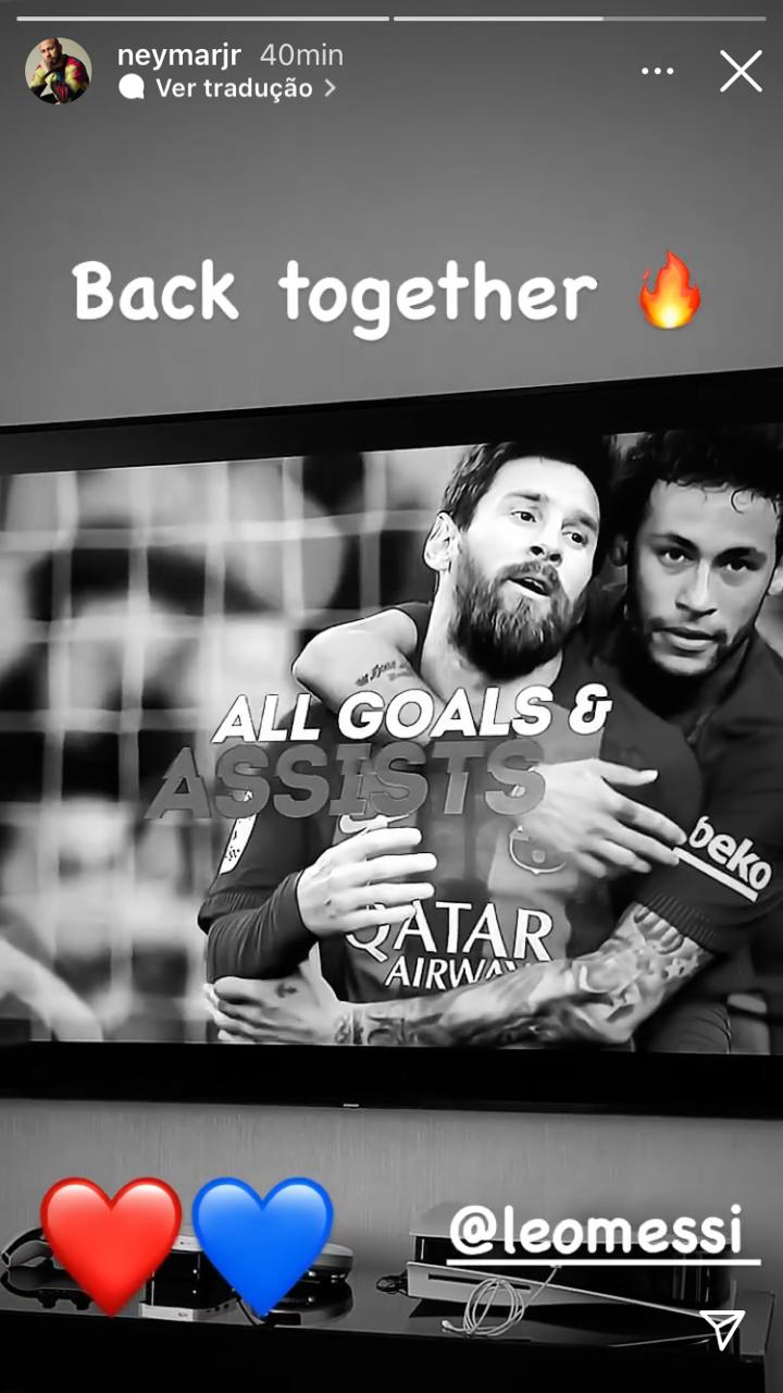 Na manhã desta terça-feira (10), Neymar publicou em sua conta no instagram um vídeo comemorando a chegada de Messi no Paris Saint-Germain. “Juntos novamente”, escreveu em inglês o camisa 10 da equipe parisiense.
