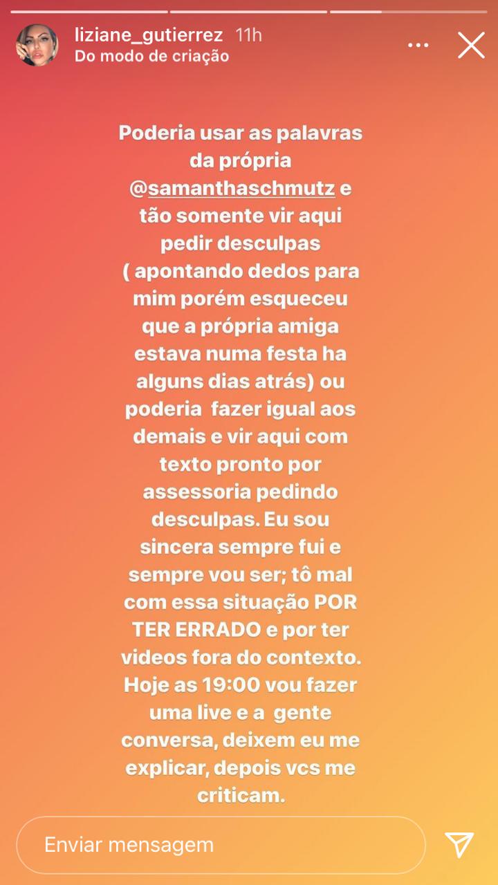A modelo publicou em sua conta no Instagram que os vídeos estão fora de contexto, mas admitiu estar errada e disse que irá se pronunciar a respeito. "Eu sou sincera, sempre fui e sempre vou ser; tô mal com essa situação por ter errado e por ter vídeos fora do contexto. Hoje 19:00 vou fazer uma live e a gente conversa, deixem eu me explicar, depois vcs me criticam", disse ela.