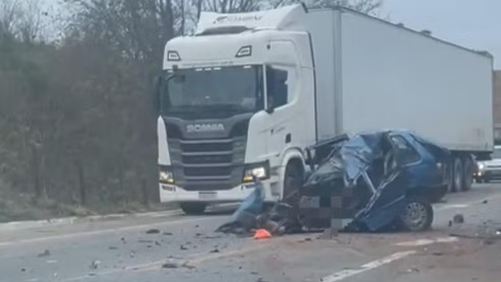 A parte frontal do automóvel ficou completamente destruída com o impacto, o que causou a morte imediata do motorista e do passageiro da frente.