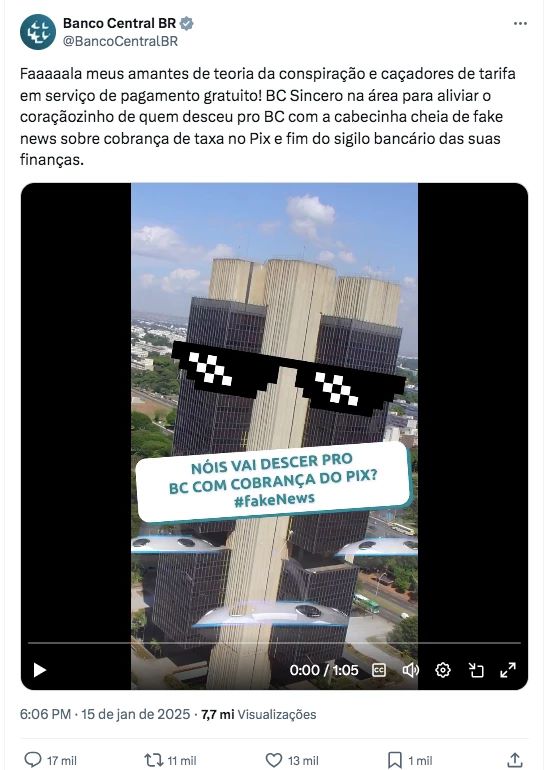 O BC divulgou um vídeo explicando que as regras para transações via Pix permanecem inalteradas, após a decisão do governo federal de suspender o monitoramento de operações acima de R$ 5 mil. Na sequência, uma mensagem destacava que era "hora de ouvir umas verdades que o vacilão da fake não quer te contar, bebê".
