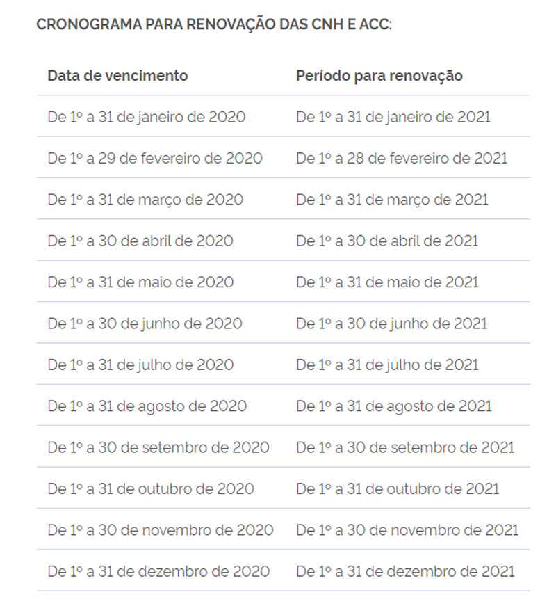 Segundo a resolução, a renovação das CNHs vencidas neste ano ocorrerá de forma gradual em 2021, de acordo com um cronograma mês a mês. Os prazos dependem dos meses de vencimento dos documentos em 2020. Se a CNH tiver vencido em dezembro de 2020, por exemplo, o condutor tem até dezembro de 2021 para renovar a habilitação.