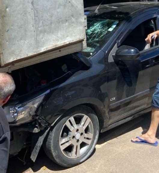 O motorista do Agile explicou que passou mal e perdeu o controle do veículo, resultando na colisão que danificou severamente a frente do carro e causou um corte em sua testa. O impacto também provocou danos no caminhão, incluindo amassados no para-choque traseiro, no suporte da placa, quebra da lanterna traseira do lado esquerdo e empeno na barra de direção.