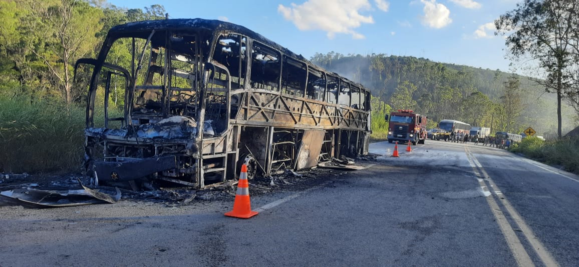 Um ônibus foi totalmente consumido pelo fogo na tarde dessa quinta-feira (17), na BR-381, em Bela Vista de Minas-MG. Dois motoristas e 22 passageiros saíram a tempo e não tiveram ferimentos.