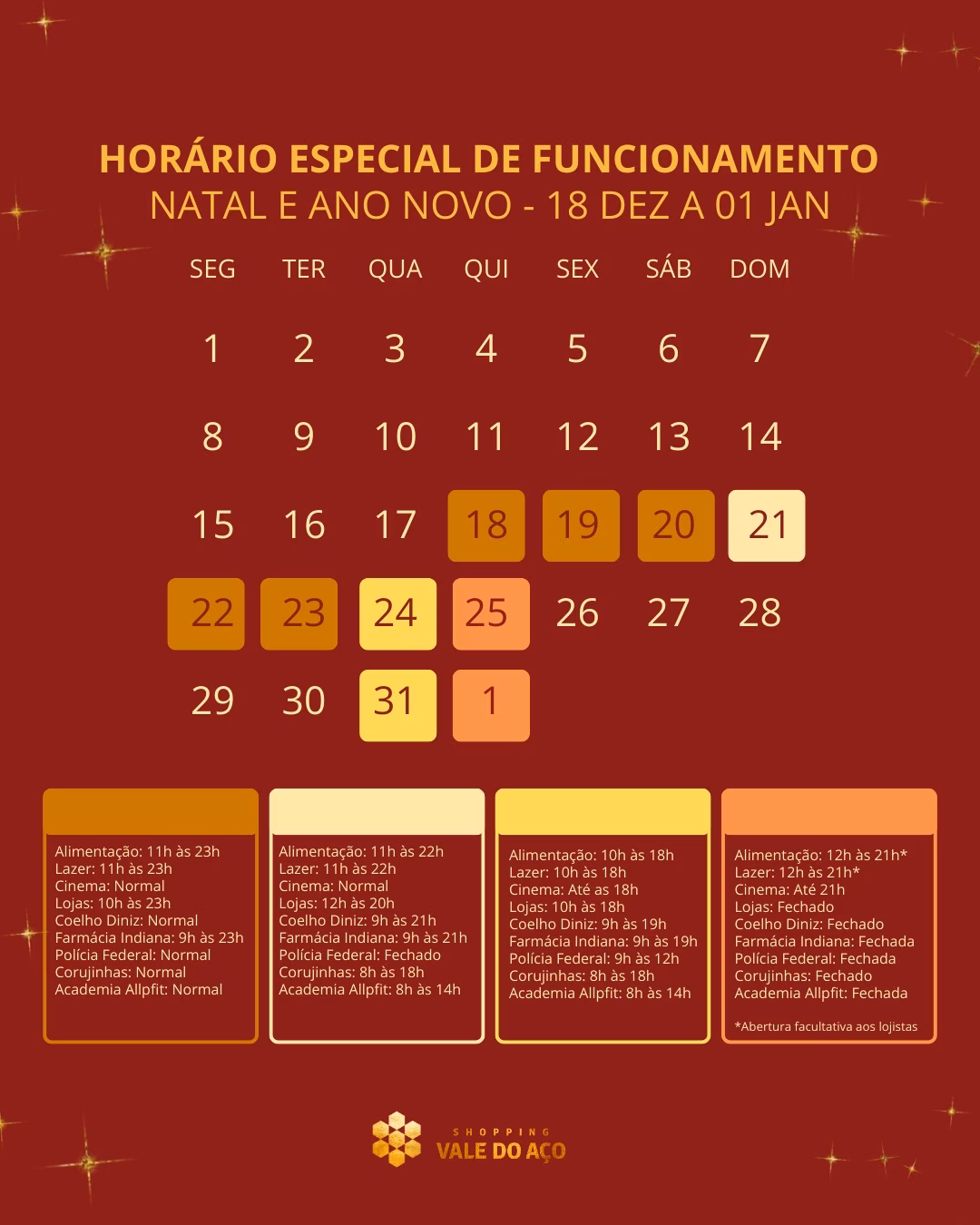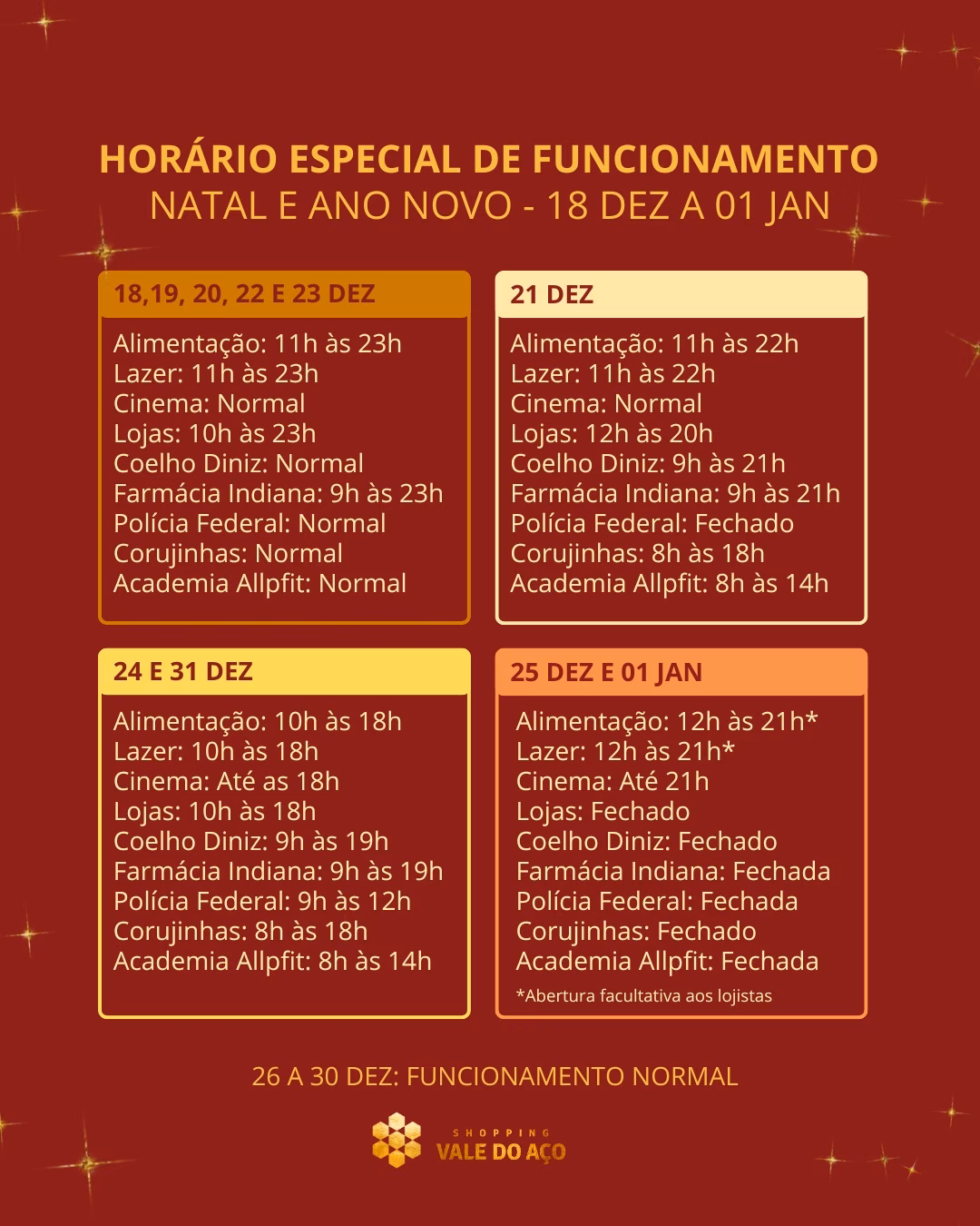Em Ipatinga, as lojas funcionarão das 9h às 20h nesta quinta (18/12) e na sexta-feira (19/12); das 9h às 17h no sábado (20); das 9h às 13h no domingo (21); e novamente das 9h às 20h na segunda (22) e na terça-feira (23). Na véspera de Natal, quarta-feira (24), o funcionamento será no horário normal de cada estabelecimento.