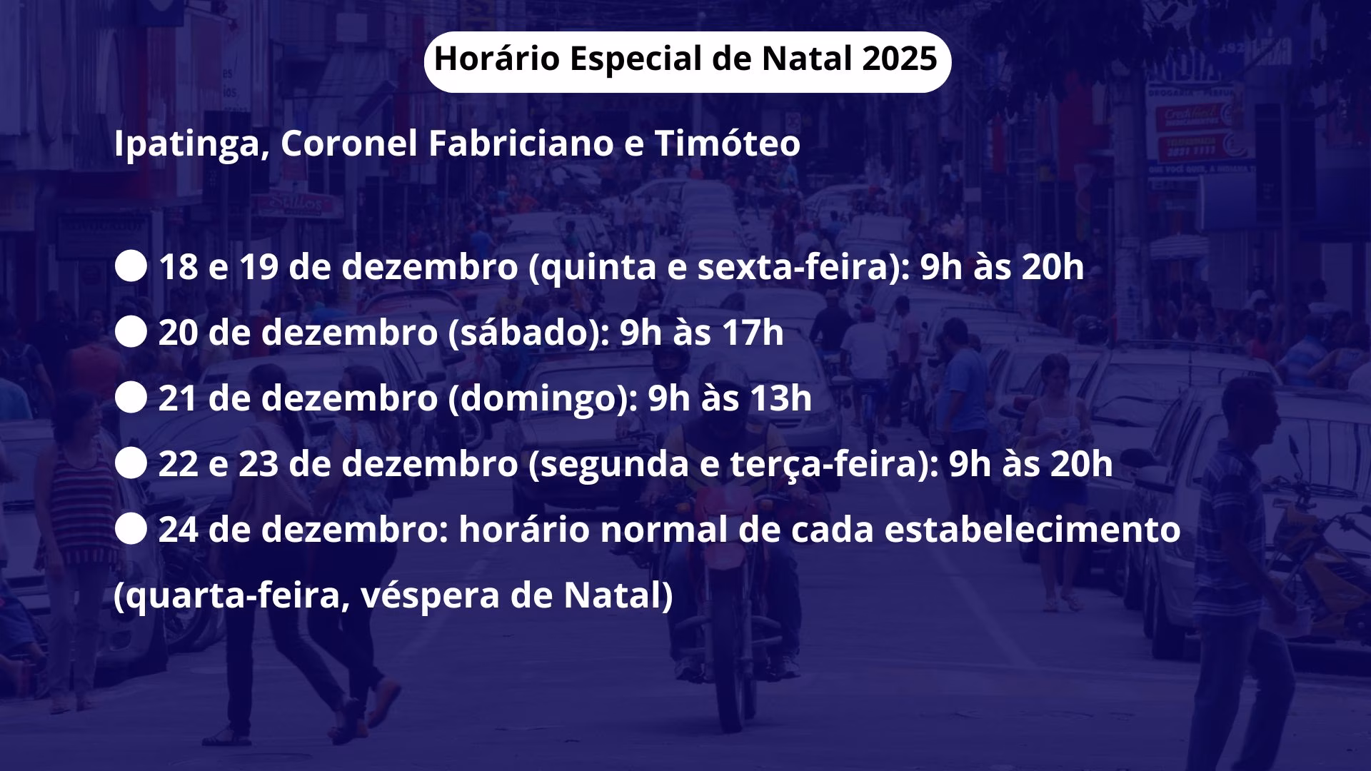 Na última semana, Coronel Fabriciano e Timóteo já haviam consolidado seu horário especial de funcionamento, por meio de acordo entre o Sindcomércio Vale do Aço e o Secteo, alinhando o comércio das três cidades ao calendário natalino regional.