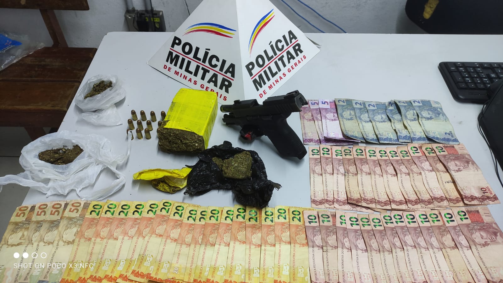 De acordo com os militares, um indivíduo estava no local e, ao avistar os policiais, ele fugiu por uma área de mata. Durante buscas no local, os policiais localizaram uma pistola calibre .380; 12 munições calibre .380; uma barra e três porções de maconha; e R$ 797.