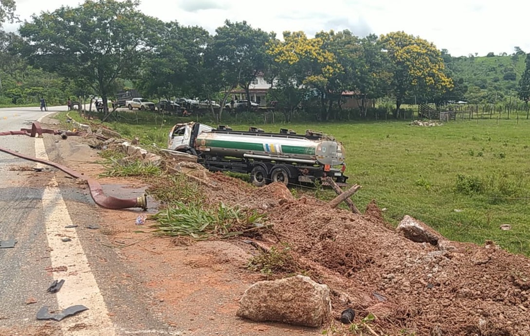 De acordo com os relatos, o caminhão estava carregado com 17 mil litros de combustível e tombou em um pequeno barranco, caindo em uma área de pastagem, às margens da rodovia.