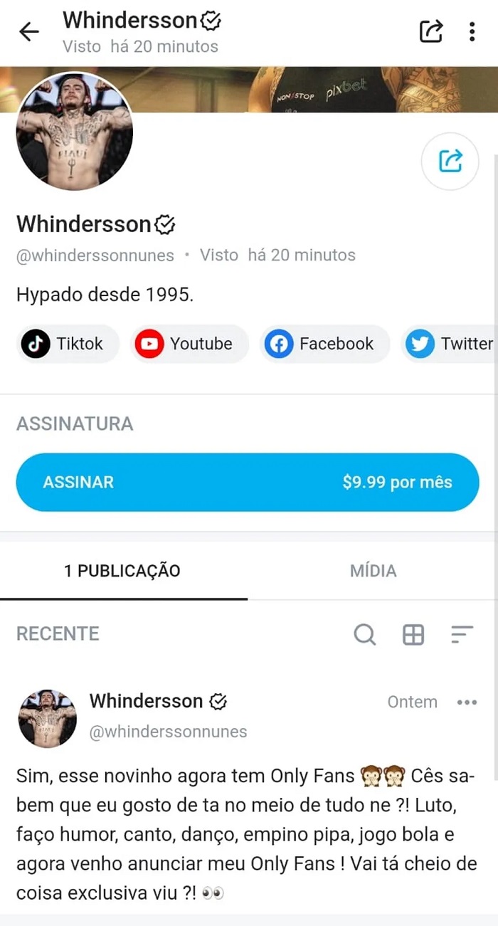 “Sim, esse novinho agora tem OnyFans. Cês sabem que eu gosto de tá no meio de tudo né?! Luto, faço humor, canto, danço, empino pipa, jogo bola e agora venho anunciar meu OnlyFans! Vai tá cheio de coisa exclusiva viu”, escreveu.