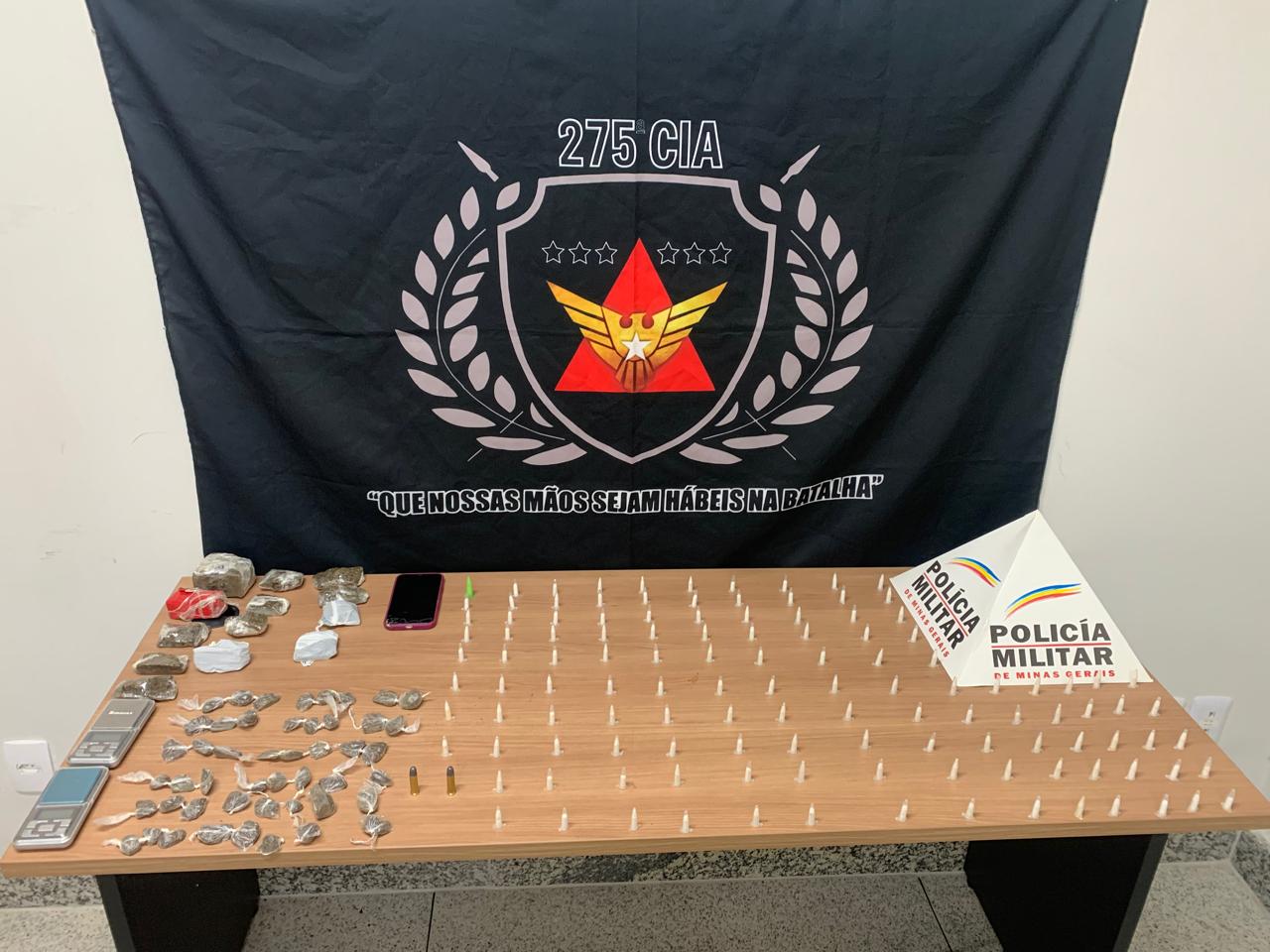 Durante a abordagem, os policiais apreenderam 123 pinos de cocaína, 48 buchas e 13 tabletes de maconha, além de balanças de precisão e materiais utilizados para embalar os entorpecentes. O suspeito, que estava sem documentos no momento da ação, ainda carregava um papel contendo instruções relacionadas ao tráfico e um celular danificado.