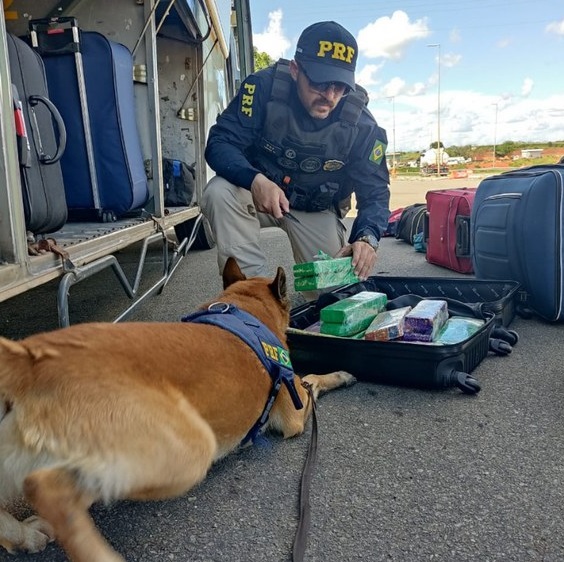 Durante a vistoria nas bagagens dos passageiros, o cão farejador K9 Mister da PRF localizou cerca de 15 kg da droga dentro de uma das malas.