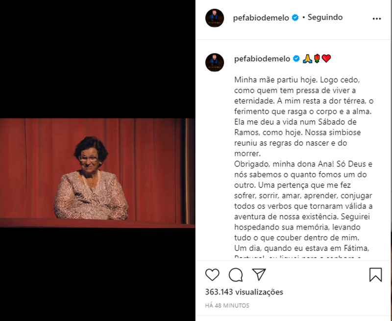 Fábio de Melo utilizou seu perfil em uma rede social e comunicou o falecimento de sua mãe. Na mesma publicação, ele fez uma homenagem a ela.