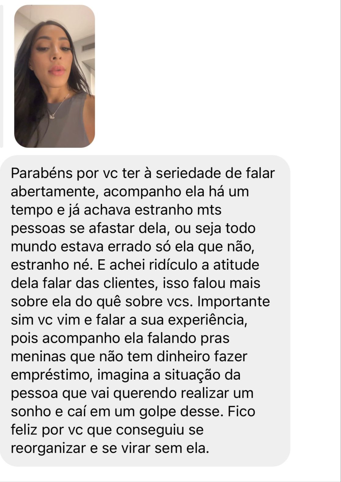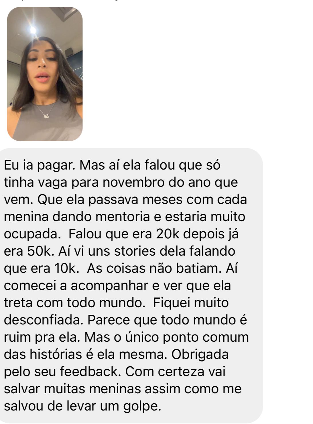 “Ela vende uma vida de luxo nas redes sociais, faz todo mundo acreditar que é possível ser uma modelo de sucesso. Mas isso não é verdade. As oportunidades são falsas, é uma vida fake. Ela promete um ano de mentoria, mas some logo em seguida. Não indica nada, nem garante os resultados. Depois que recebe, não responde mais. Assim como para outras modelos, me prometeu trabalhos e vida luxuosa, mas nada aconteceu”, conta.