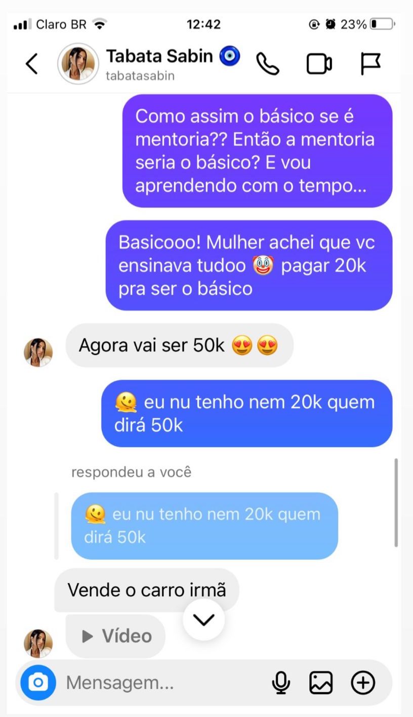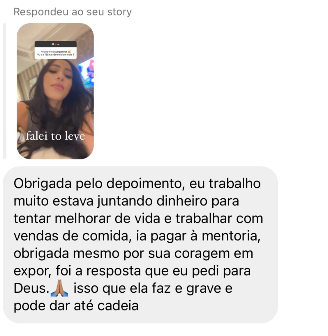 “Fiquei desprotegida em um país que não conheço, foi tenso. Fiquei com medo. O pior poderia acontecer. Comprei uma mentoria que prometia muita coisa. Ela faz a gente acreditar em tudo quando posta uma vida maravilhosa na internet. E na verdade é tudo mentira. Fui enganada e decidi expor tudo para alertar outras mulheres. Me sinto lesada e não desejo isso para mais ninguém".
