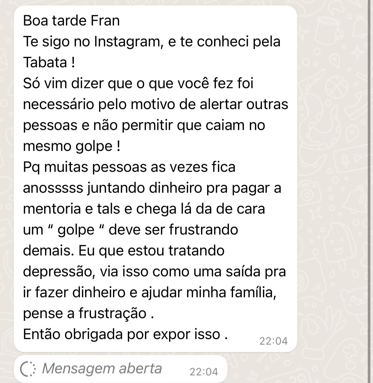 O que era para ser uma viagem inesquecível com direito a trabalho garantido e muito dinheiro, se tornou um grande pesadelo. A modelo Franciele Reis perdeu R$ 10 mil ao cair em golpe e decidiu expor a influencer Tabata Sabino, que estaria por trás de tudo isso. Na web, outras vítimas apareceram depois da denúncia.