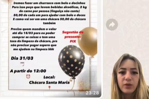 Um convite de aniversário repleto de exigências inusitadas tornou-se o centro das atenções no TikTok, após Karen Guimarães compartilhar um vídeo revelador. A postagem em questão detalha o convite feito pela amiga de sua irmã para uma festa, no qual os convidados são instruídos a levar sua própria bebida, fornecer dois quilos de carne (explicitamente excluindo linguiça) e contribuir com R$ 100 para cobrir custos do bolo, doces e aluguel do local da festa. Além disso, era esperado que os presentes fossem entregues via Pix.